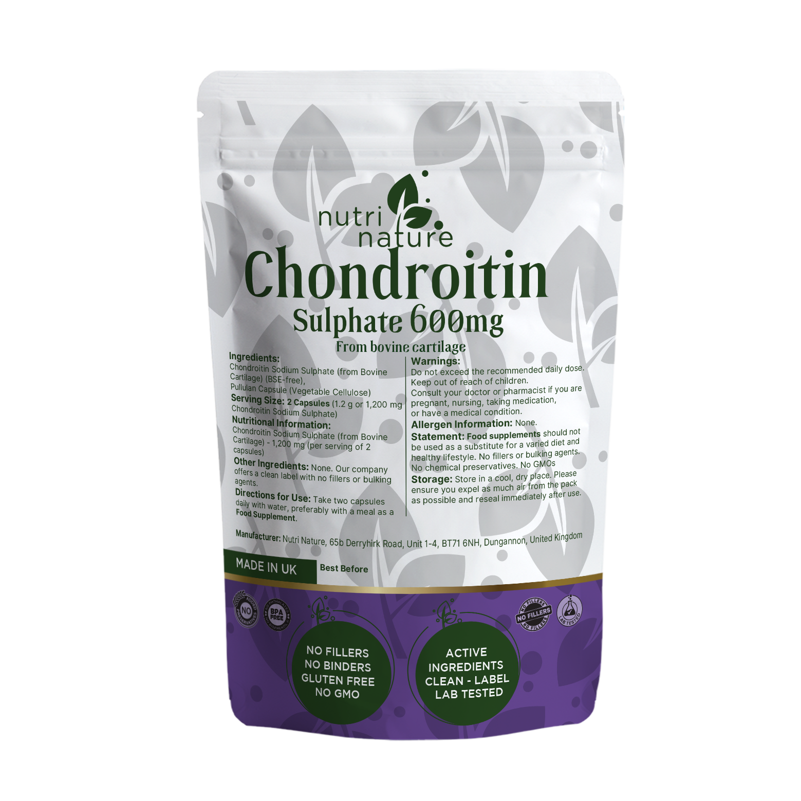 Our Chondroitin Sodium Sulfate supplement delivers 1,200 mg per serving (2 capsules), sourced from BSE-free bovine cartilage.